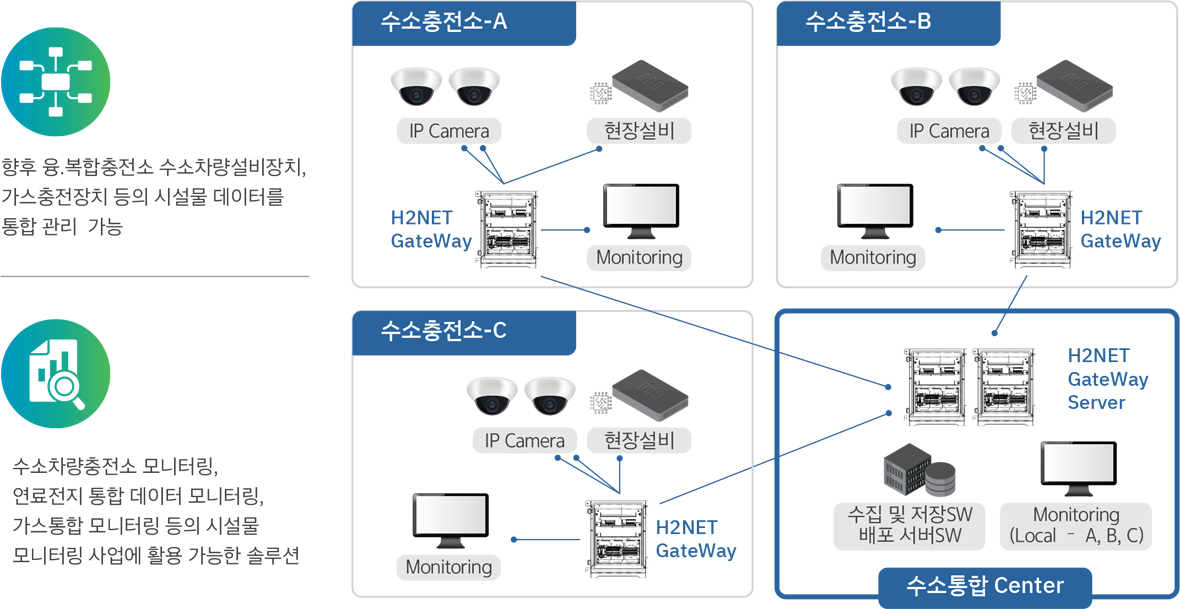 다양한 통신방식을 사용하는 수소설비, 가스설비, 연료전지 들의 이 기종 장비들 간의 실시간 데이터, 통신을 가능하게 하는 Gateway Device의 다양한 통신방식을 활용하여 미디어 변환 및 프로토콜 변환 기능을 통해 수소설비, 가스설비, 연료전지 등 현장 장비들을 효과적으로 통합 할 수 있는 Middleware 플랫폼 입니다.